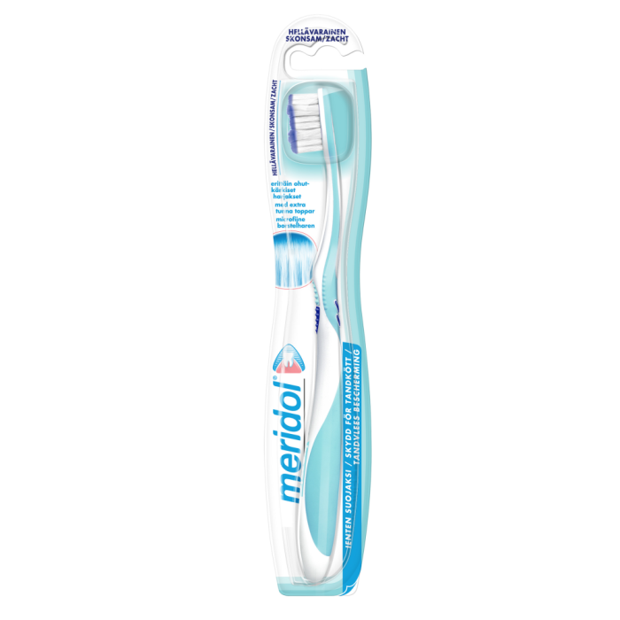 Meridol tandborste har mycket tunt och mjukt borsthuvud. Borsthuvudet är samtidigt mycket effektivt och passar för noggrann plackrengöring, särskilt vid tandköttskanten.