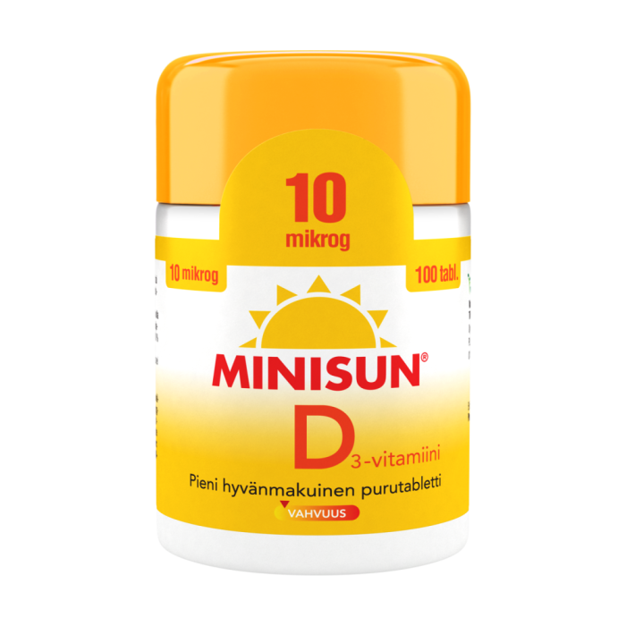 Suomessa kehitetyt Minisun D-vitamiinitabletit sopivat koko perheelle. Minisun 10 mikrog purutabletti sopii käytettäväksi ympäri vuoden. Ksylitolilla makeutetut tabletit voi imeskellä, pureskella, niellä tai murskata.