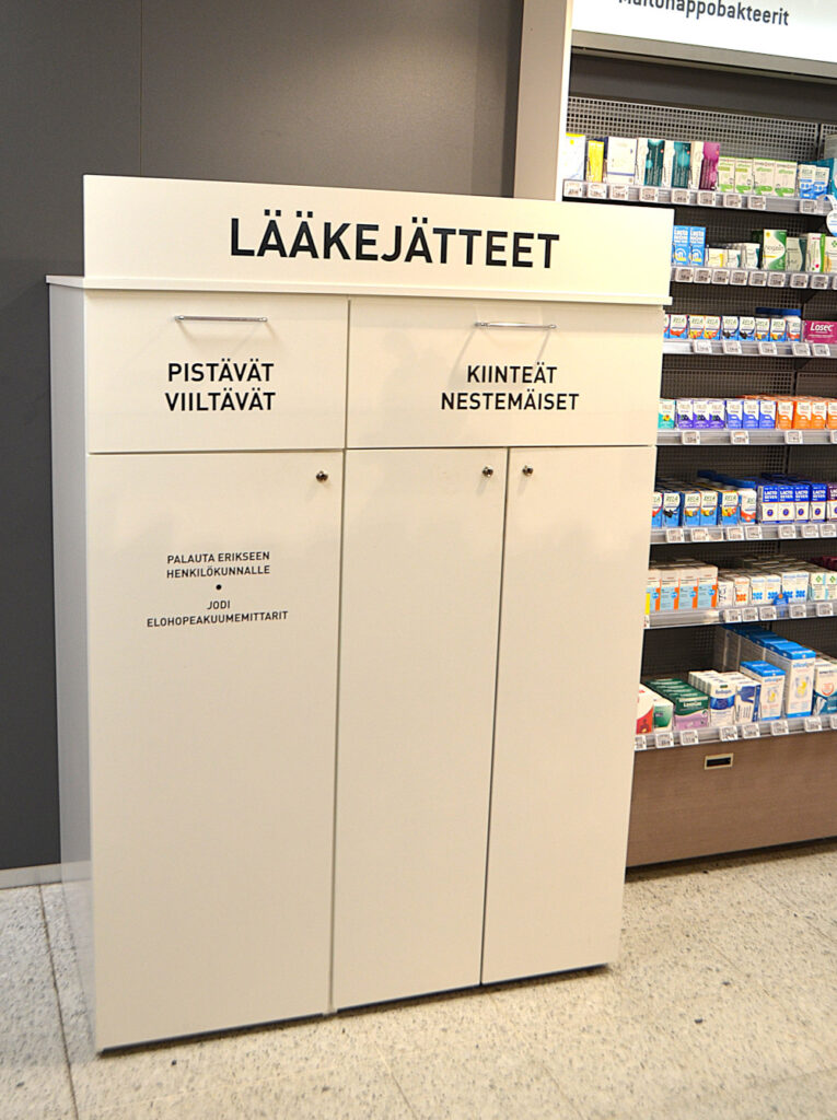 - Apteekki ottaa vastaan ainoastaan lääkejätteitä ja elohopeaa sisältäviä kuumemittareita sekä ruiskuja ja neuloja. Apteekki ei ota vastaan muita jätteitä (esim. kemikaaleja, hiuslakkapulloja, paristokäyttöisiä kuumemittareita tai muita sähkölaitteita, paristoja ym.).